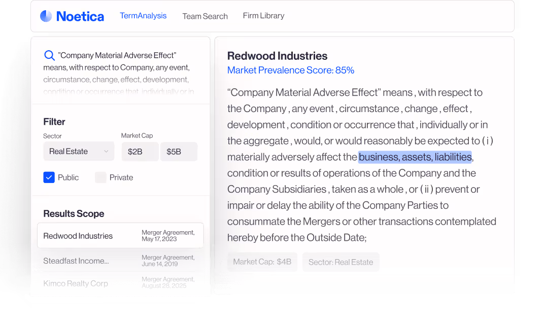 Book a personalized demo to see how Noetica’s AI-powered platform helps legal and financial teams unlock better insights and drive faster deals.