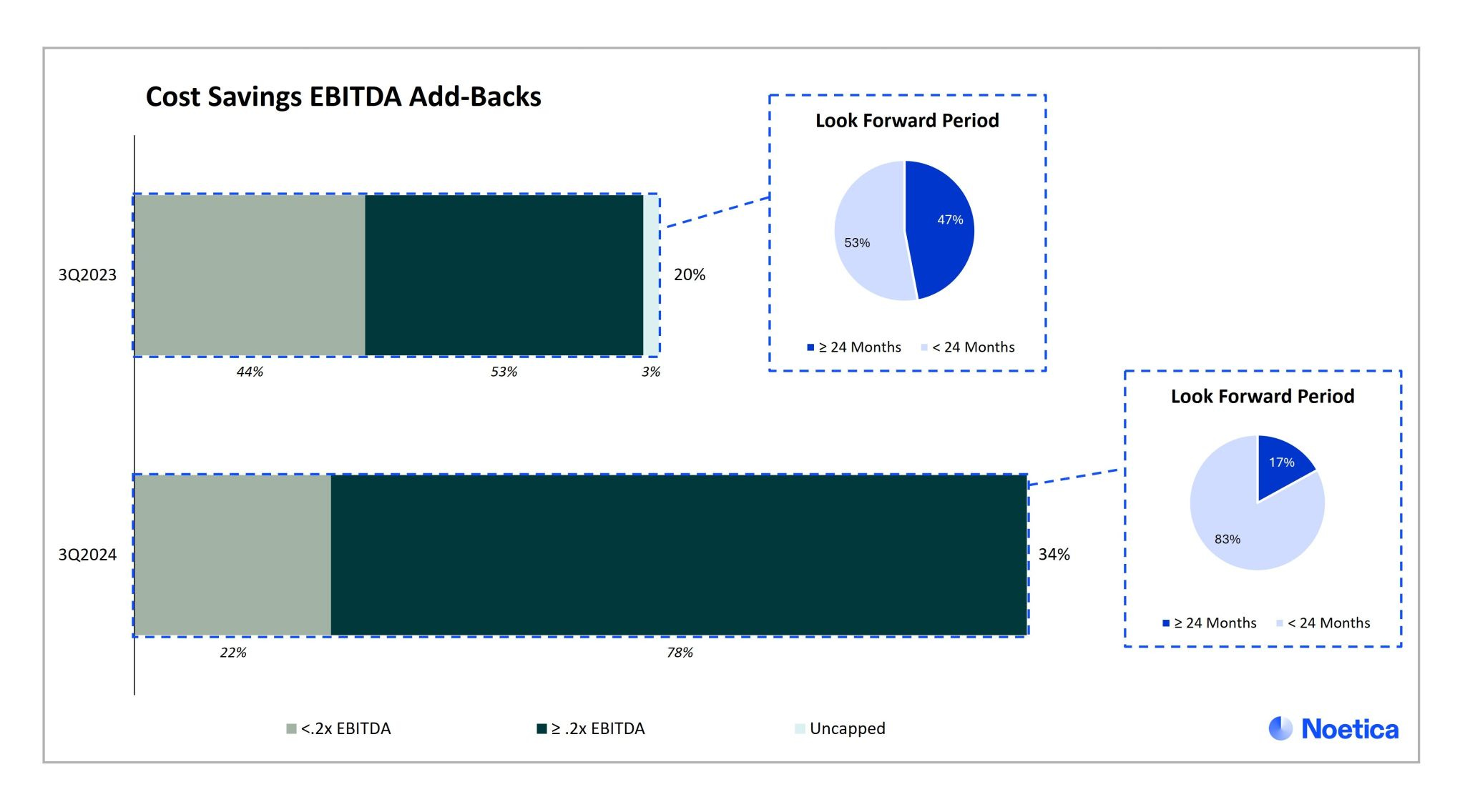 However, in Q3 2024, 78% of deals permitting cost savings addbacks included caps equal to or greater than 20% of EBITDA, compared to 53% of such deals in Q3 2023. In addition, 17% of such deals in Q3 2024 included a look-forward period of 24 months or greater, compared to 47% of Q3 2023.
