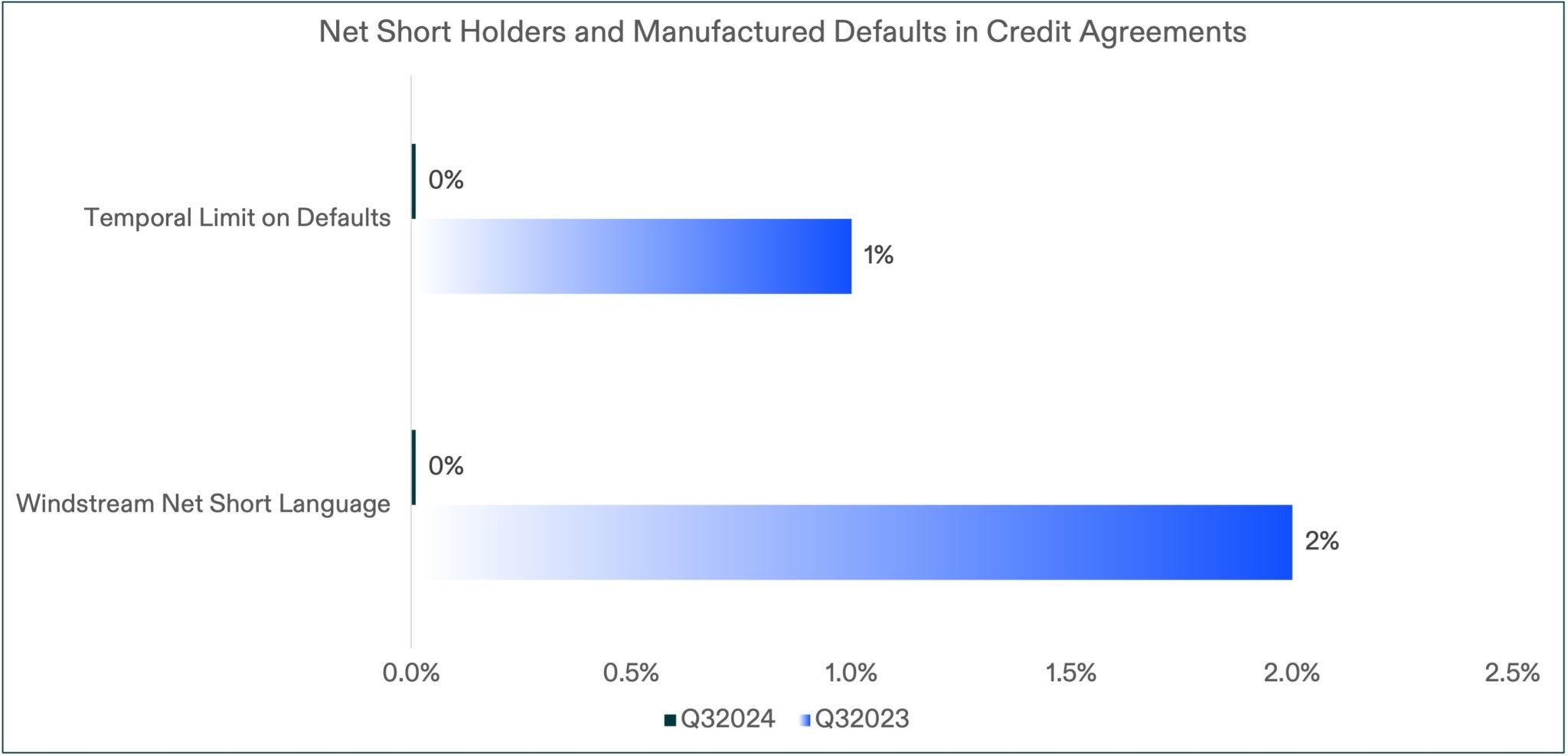 In the third quarter of 2024, no publicly filed high yield credit agreements included Windstream net short holder protections or temporal limitations on default. By comparison, 2% of similar documents filed in the same period of 2023 included net short holder protections, and 1% included temporal limitations on default. Will these borrower protections become a thing of the past?